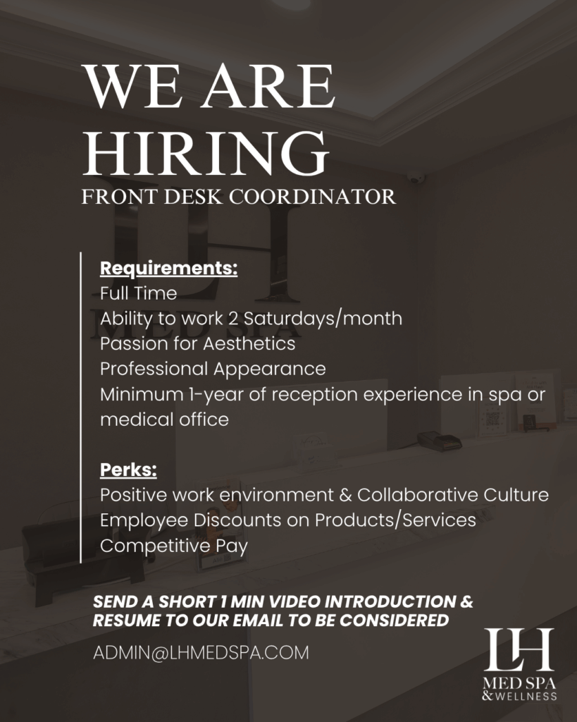 Think you’d be a perfect fit? Send your resume to admin@lhmedspa.com – we can’t wait to hear from you!